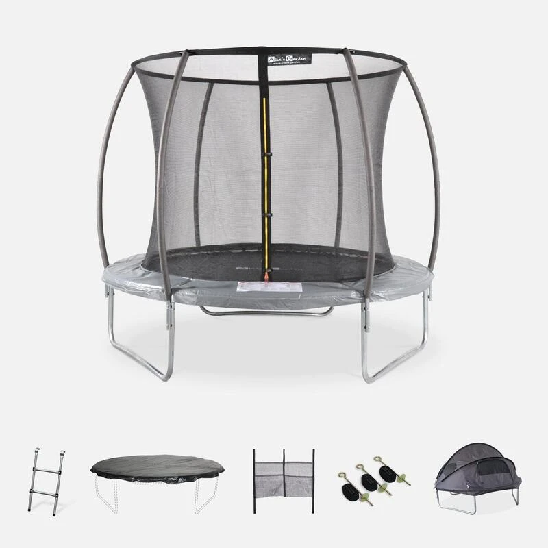 Trampoline 250cm filet intérieur avec pack d’accessoires + Tente de camping et sac de transport
