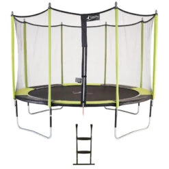 Trampoline rond Ø430cm robuste. 88 ressorts de 145mm. Filet de sécurité facile à abaisser. Poteaux fixés par bague : plus robuste. Norme CE & NF EN 71-14. Structure Garantie 2 ans. Pieces dispo +10ans
