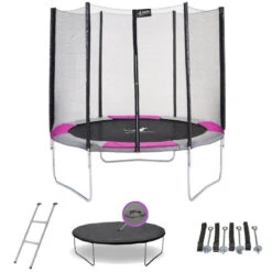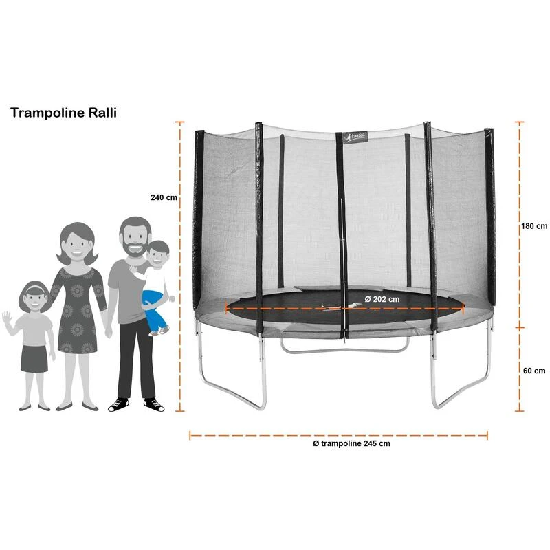 Trampoline rond Ø250cm robuste. 48 ressorts de 140mm. Filet de sécurité cousu aux poteaux. Norme CE & NF EN 71-14. Structure Garantie 2 ans. Pièces dispo +10ans. Kangui France